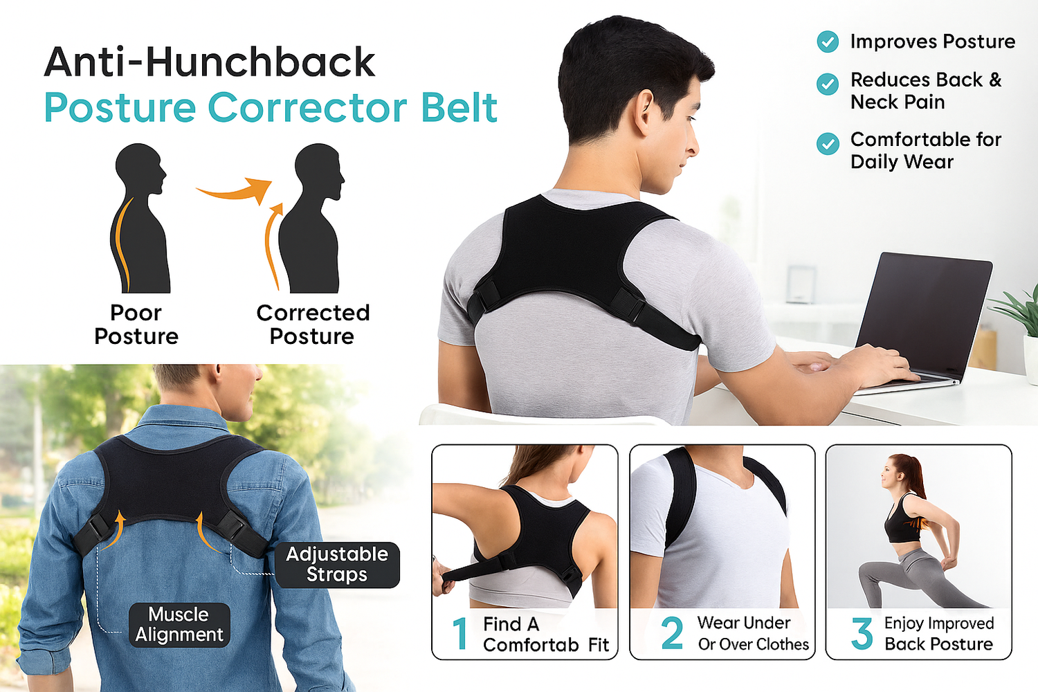 Améliorez votre posture grâce à ce correcteur de dos léger et réglable qui soutient délicatement l'alignement de la colonne vertébrale pour réduire l'affaissement et soulager les tensions dorsales . Conçu pour un usage quotidien, il vous aide à vous tenir plus droit, à vous sentir plus fort et à bouger avec plus d'assurance .